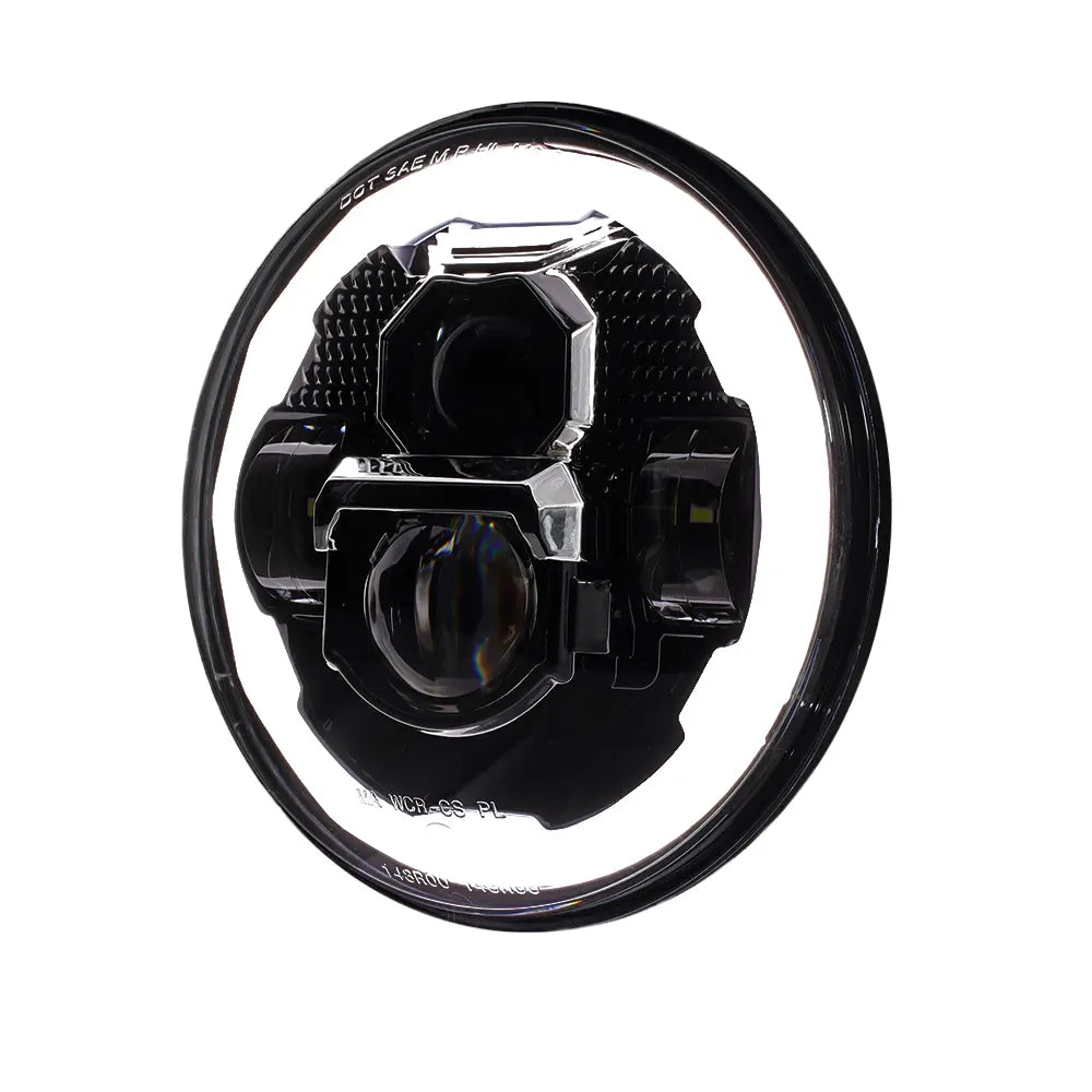 En af de mest iøjnefaldende funktioner ved denne forlygte er det omskiftelige halo-ring/positionslys i hvid/grå. Denne LED-forlygte passer til de fleste 7" forlygtehuse og fungerer som en effektiv LED-konvertering til udskiftning af standard H4-enheder, hvilket giver et meget stærkere og hvidere lys. Forlygteenheden leveres komplet med ledninger og et 3-polet stik, der er identisk med en standard H4-pære, hvilket sikrer en nem plug & play-installation.