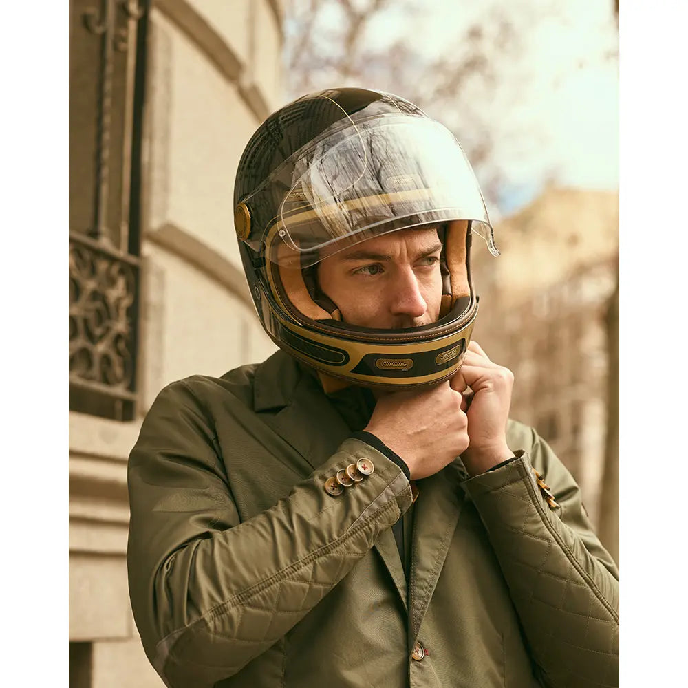 Den er designet til dem, der leder efter en klassisk æstetik og er lavet af kulfiber. Læderinteriør med brugervenligt dobbelt ringspændesystem for perfekt pasform. Har aftagelig, vaskbar indvendig polstring med flere densiteter, ventilationsåbninger og fastgørelse bagpå til montering af briller. Indsprøjtet visir sikrer klart udsyn under alle vejrforhold. Roadster II-hjelmen er ECE/UN R.22.06-godkendt.