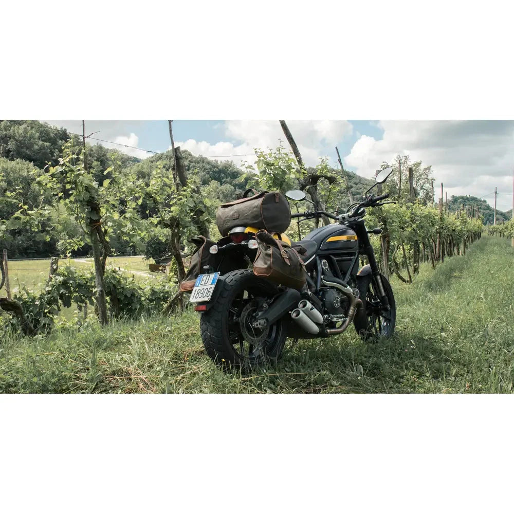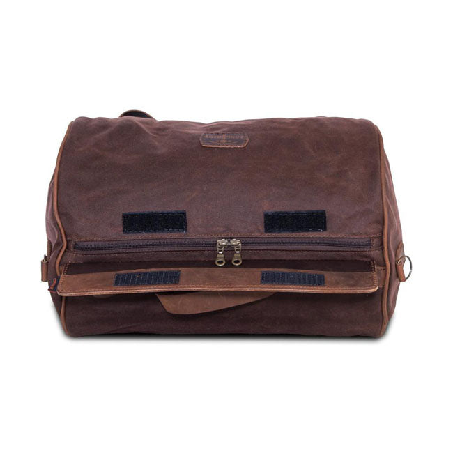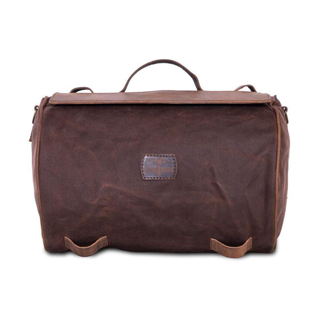 Den lille rejsetaske til motorcykel er en alsidig 17,5 liters rulletaske fremstillet af slidstærkt voksbehandlet bomuldslærred med polyesterforing og detaljer i olieret rangerlæder. Den er perfekt til enhver rejse og kan fastgøres bag på din motorcykel eller bæres over skulderen. Tasken har en aftagelig, justerbar skulderrem og to kraftige elastiske fastgørelsesremme, der sikrer, at den sidder godt fast.