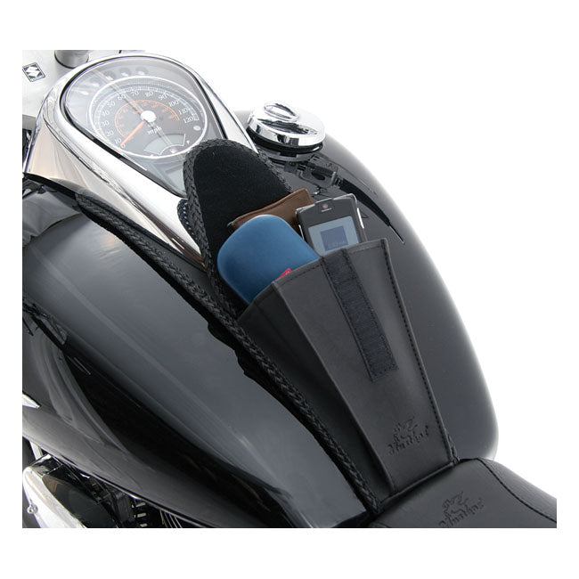Denne tankhagesmæk tilføjer lidt ekstra funktionalitet uden at ødelægge motorcykelens linjer. Den følger tanken tæt og bruger de originale beslag, så monteringen er enkel. Den indbyggede lomme giver plads til små nødvendigheder, og filtbaggrunden hjælper med at beskytte lakken nedenunder.