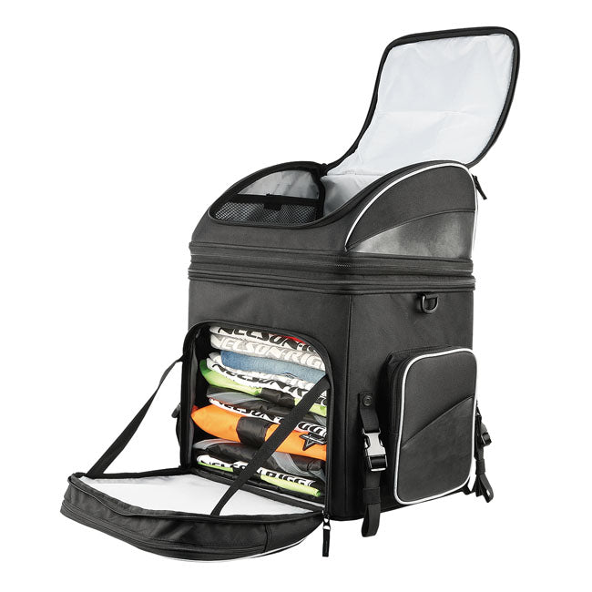 Route 1 Destination-tasken er designet til motorcyklister, der har brug for stor opbevaringsplads med fleksibel indretning. Med en samlet kapacitet på 53,5 liter har den opdelte øvre og nedre rum, der kan omdannes til et stort opbevaringsrum. Tasken er fremstillet af UltraMax-stof for maksimal UV-beskyttelse og bevarer sin form takket være en stiv konstruktion og et solidt bundpanel. Med flere udvendige lommer, en 3" udvidelsessektion, reflekterende piping og et vandtæt regnovertræk er den designet til lange ture og brug i al slags vejr.