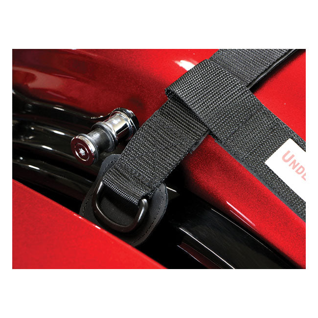 Route 1 bagagefastgørelse under sædet er den perfekte løsning til motorcykler uden ryglæn eller bagagebærer. Den monteres under passagersædet og skaber fire sikre fastgørelsespunkter til bagagestropper. Med robuste materialer og beskyttende bagside holder den dit udstyr stabilt og beskytter samtidig din motorcykels lak.