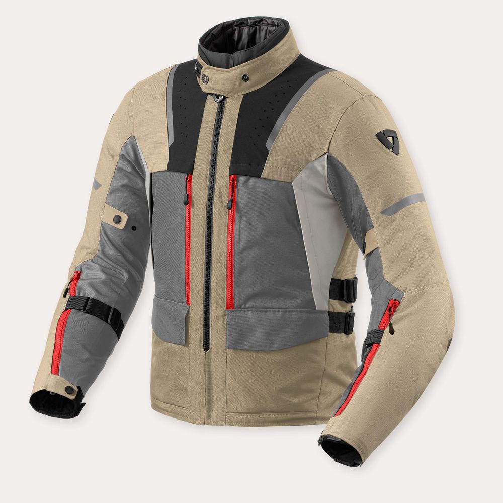 - Flexisnap ved kraven: REV'IT! flexisnap gør det muligt nemt at justere kravens omkreds og tilpasse pasformen til den enkelte rytter. En jakke bliver ofte brugt i mere end én sæson, og flexisnap gør det muligt at justere kraven på få sekunder. Om vinteren giver en bredere kraveomkreds mulighed for at kombinere jakken med en balaclava eller vindkrave, mens en bredere kraveomkreds om sommeren lukker den vigtige kølige vind ind i kraven.