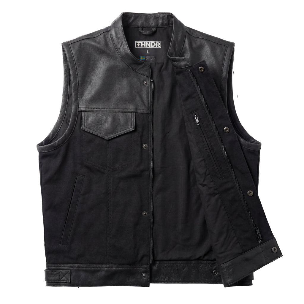 Breakout motorcykelvesten kombinerer old school biker-følelsen med moderne materialer, der faktisk giver mening på vejen. Du får håndlavet bøffellæder øverst og canvas på kroppen, en lettere og mere moderne version af den klassiske vest i fuld læder. Mesh-foringen holder luften i bevægelse på længere ture, og der er nok lommeplads til at opbevare din telefon, tegnebog og alt andet, du har med dig hver dag.