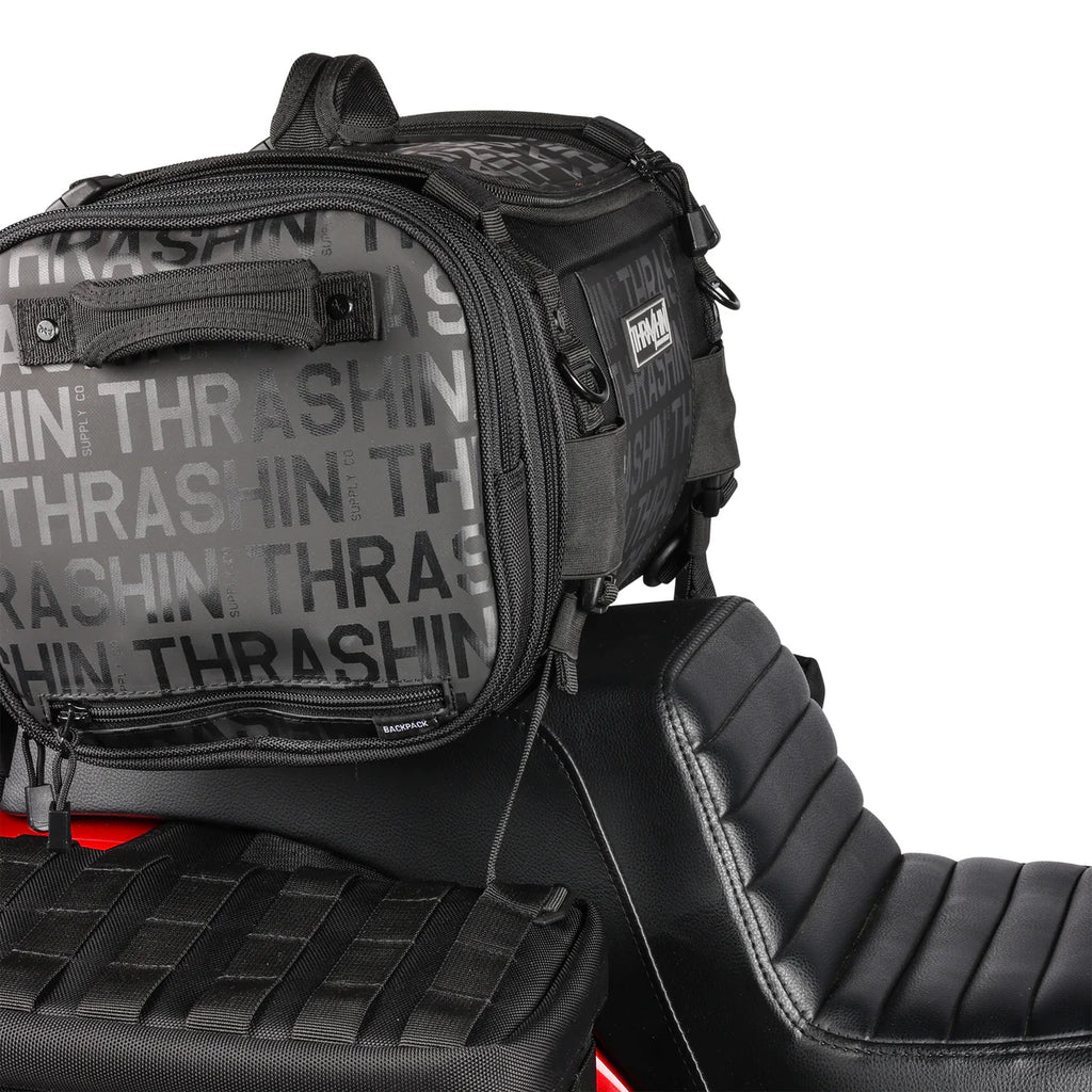 Dette remsæt gør det nemt at montere ekstra udstyr på dit Thrashin-udstyr. Plastknapperne føres gennem MOLLE-bånd for et sikkert hold, og de modsatte spænder med sideknapper giver dig mulighed for at fastgøre passagertasken direkte uden behov for en sissy bar. Det fungerer også til at fastgøre andre tasker eller bagage oven på eller langs siderne af Thrashin-sadeltasker.
