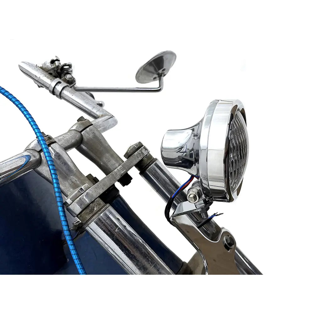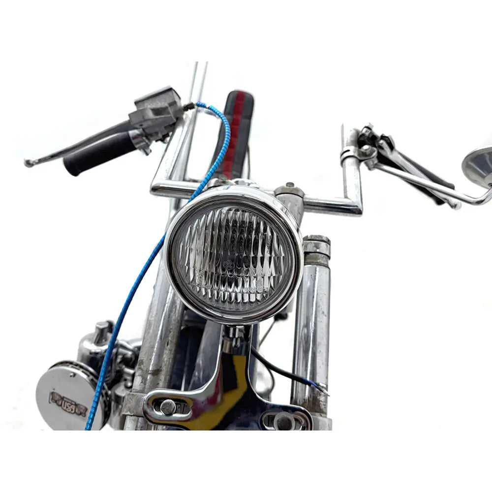 Denne forlygte i retrostil fra V-Twin MFG giver klassiske chopper-vibes, bygget til at skinne klart og se skarp ud på ethvert custom setup.